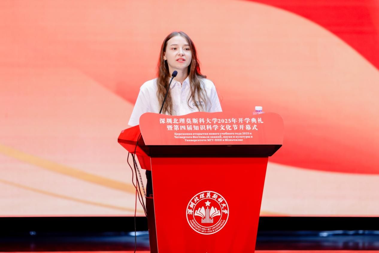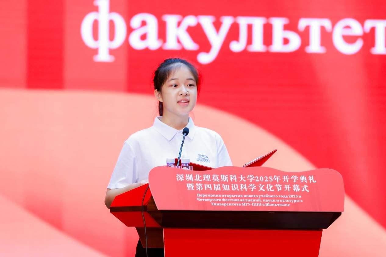 Студентка химического факультета Чэнь Чжаожу, поступившая в 2025, выступила от имени первокурсников бакалавриата. Она поделилась своим пониманием и ожиданиями от обучения в Университета МГУ-ППИ в Шэньчжэне, омыслив их через призму миссии университета, отношения студентов к учёбе и практического развития. В завершение Чэнь Чжаожу обратилась ко всем первокурсникам с призывом: